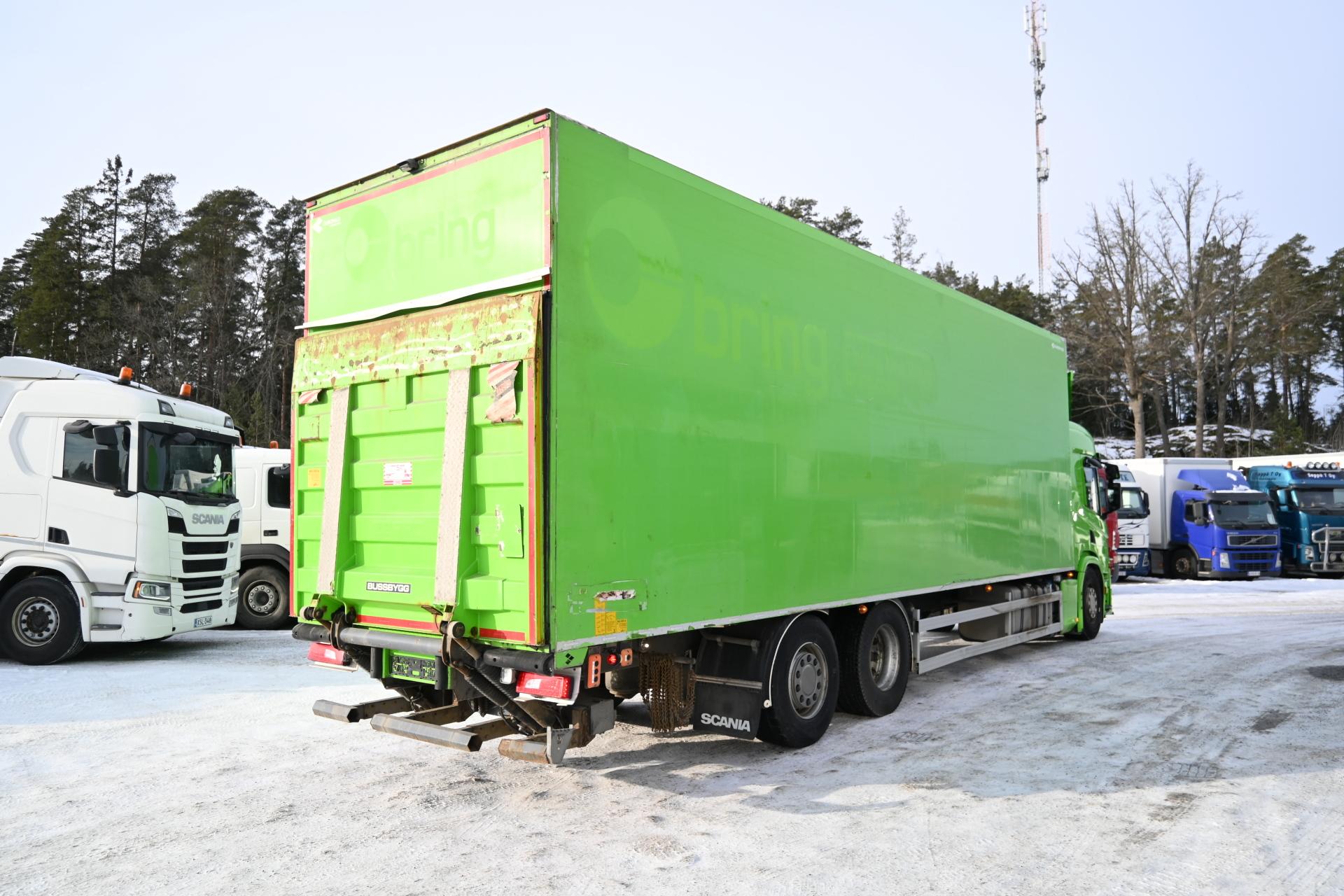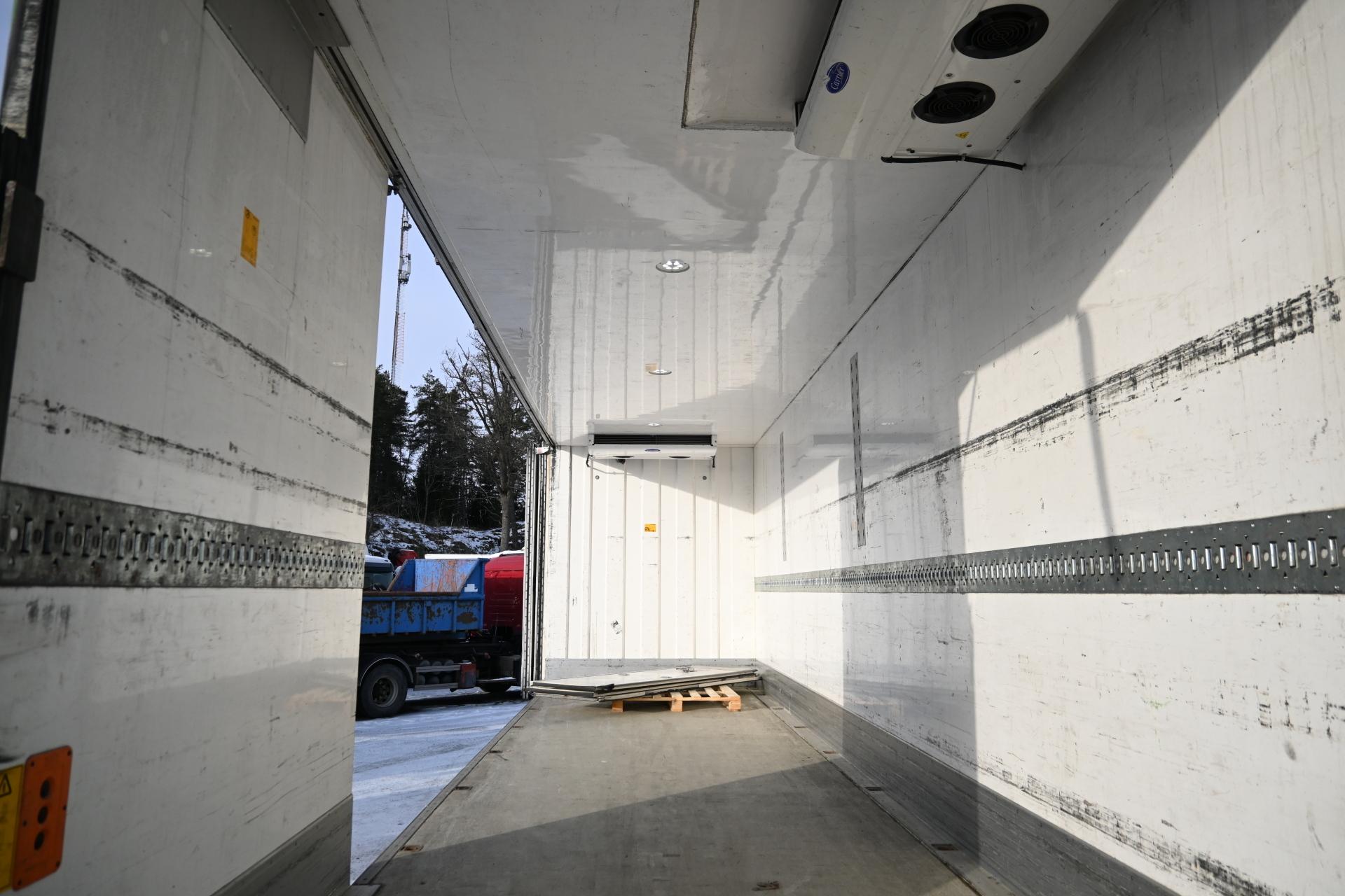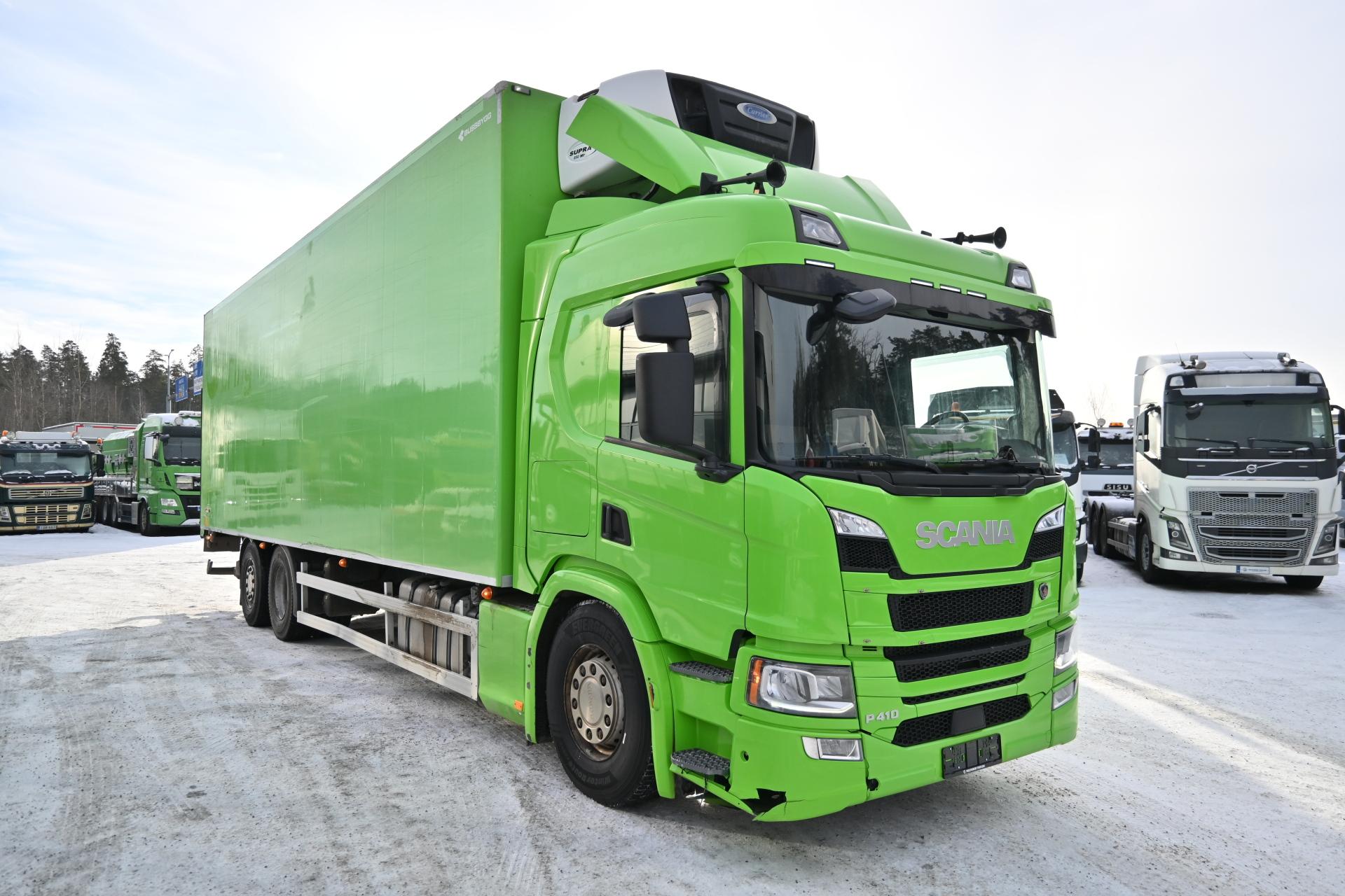 Scania P410 6×2*4 Isolla sivuaukeavalla korilla ja kylmäkoneella